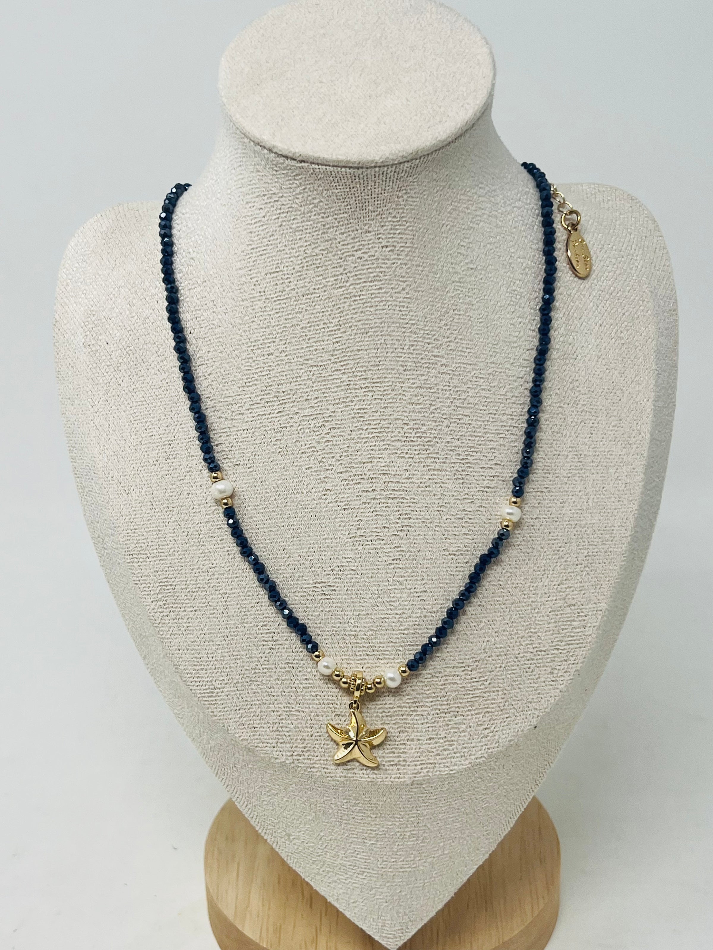 Beaded Necklace with Pearls & Gold Starfish Pendant(navy)