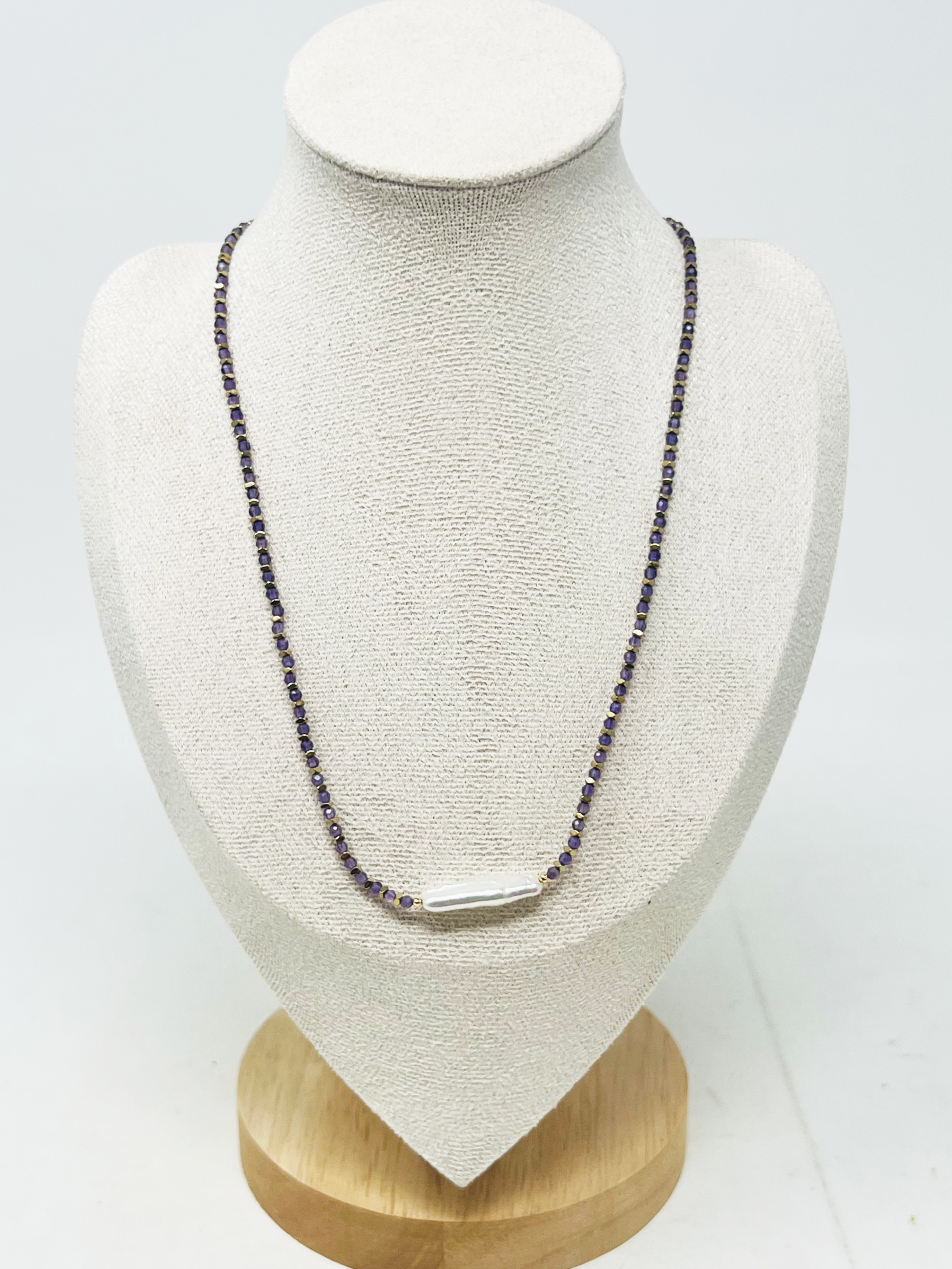 Colorful Semi-Precious Bead Necklace with Pearl Bar Pendant(purple)