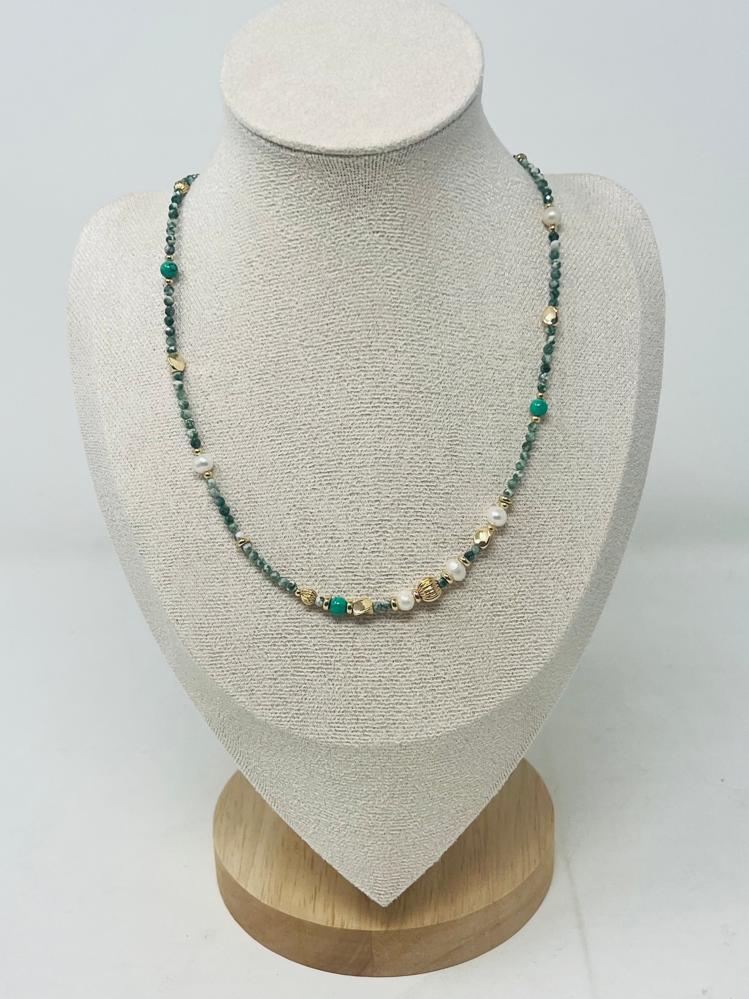 Miyuki Beads, Semi-Precious Stone & Pearl Beaded Necklace(mossy green)
